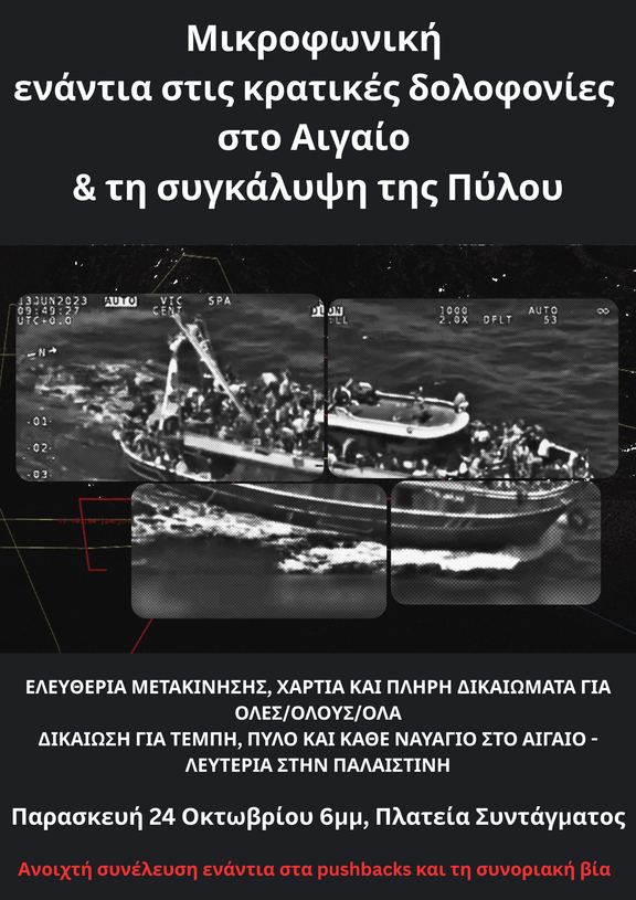 Μικροφωνική συγκέντρωση έναντια στις πρόσφατες κρατικές δολοφονίες στο Αιγαίο και τη συγκάλυψη του κρατικού εγκλήματος στην Πύλο. Παρασκευή 24 Οκτωβρίου στις 6μμ στην Πλατεία Συντάγματος