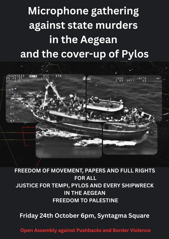 Microphone gathering against the recent state murders in the Aegean and the cover-up of the state crime in Pylos. Friday 24 October at 6pm, at Syntagma square, Athens