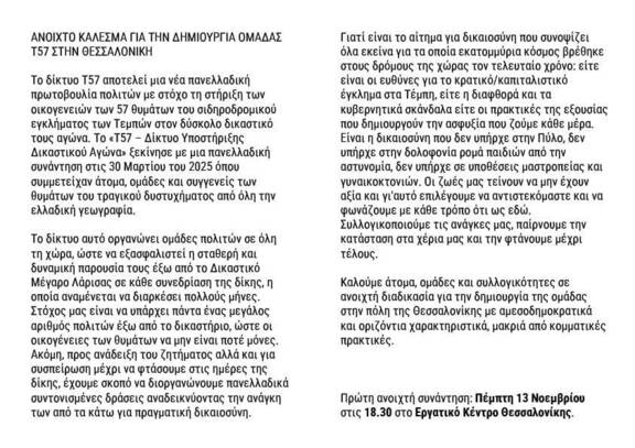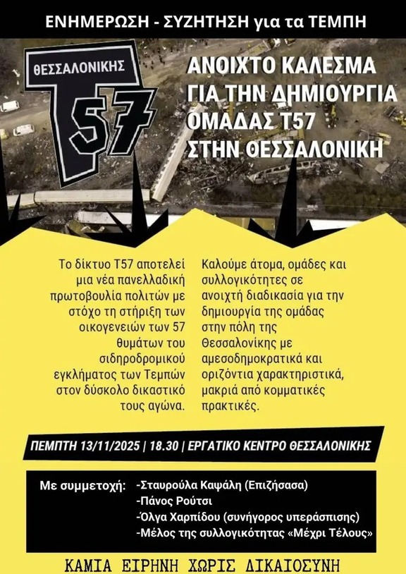 Εκδήλωση για τα Τέμπη κ ανοιχτό κάλεσμα για την σύσταση ομάδας Τ-57 Θεσ/νίκης