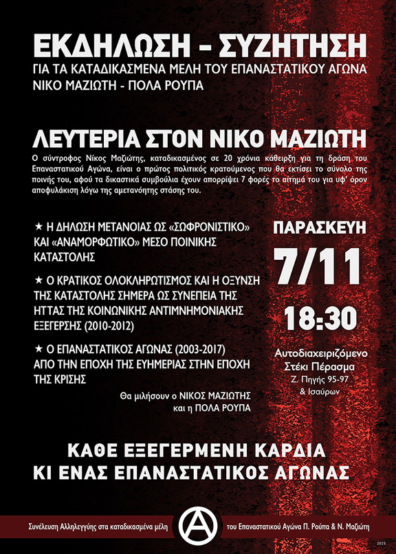 ΕΚΔΗΛΩΣΗ-ΣΥΖΗΤΗΣΗ για τα καταδικασμένα μέλη του Επαναστατικού Αγώνα Νίκο Μαζιώτη και Πόλα Ρούπα