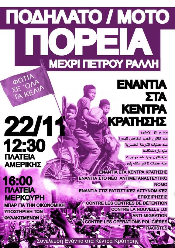 We are calling this demonstration to connect the frequent racist ID checks in plateias in the centre of Athens and on public transport to the mass incarceration in detention centres which are located all around Greece in isolated areas far from the cities. When people are detained while travelling, exiting metro stations, returning from work and relaxing in public spaces, they are taken to police stations and often kept in holding cells for days, weeks or months before being transferred to Amygdaleza, where conditions are intended to increase suffering. We know that inside Amygdaleza there is mass overcrowding, broken water systems, bed bug infestations, minimal access to medical and legal support and inedible food. The new anti-migration law aims to increase the state's powers of incarceration: through imprisoning people who enter without documents, extending the time limit of detention from 18 months to 24 months, and forcing people to choose between deportation or prison. Through the new law we are likely to see not only a further escalation in the criminalisation of migrantised/racialised people, but also an expansion of prison infrastructure and populations, given the already dire overcrowding in both criminal prisons and detention centres.