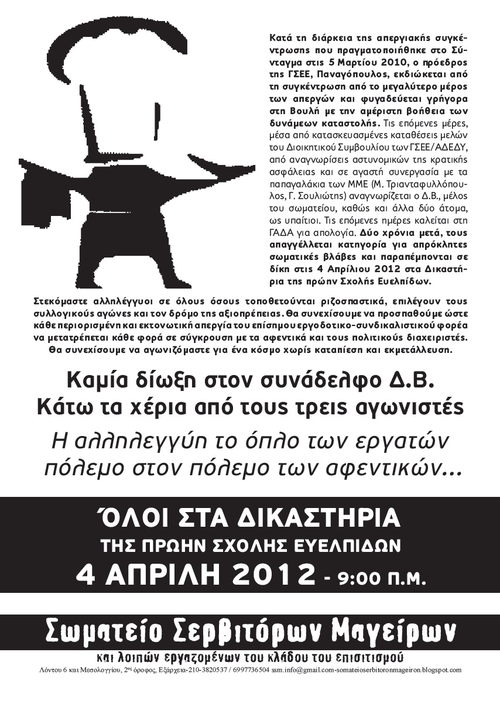 Στις 4 Απριλίου 2012 οι Ν.Μ., Δ.Β. και Κ.Π. καλούμαστε στα δικαστήρια της πρώην σχολής Ευελπίδων να δικαστούμε για την εκδίωξη του επαγγελματία εργατοπατέρα, επίδοξου βουλευτή και υπάλληλου του ΣΕΒ Παναγόπουλου από την απεργιακή συγκέντρωση που πραγματοποιήθηκε στις 5 Μαρτίου 2010 στο Σύνταγμα.