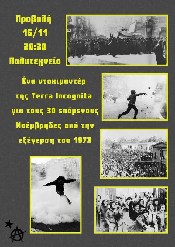 Προβολή ντοκυμαντέρ από το κινηματικό αρχείο της κατάληψης Τerra Incognita για τους πρώτους 30 Νοέμβρηδεσ από την εξέγερση του Πολυτεχνείου το 1973