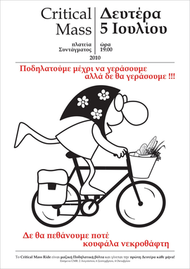 Η ιδέα του critical mass είναι μία μαζική βόλτα με ποδήλατα, ξεκινώντας από ένα προκαθορισμένο σημείο εκκίνησης κάθε μήνα, μια συγκεκριμένη μέρα. Σίγουρα ο σκοπός δεν είναι η ταχύτητα σε μια τέτοια βόλτα, αλλά κυρίως η προβολή του ποδηλάτου. Είναι μια γιορτή για το ποδήλατο στους δρόμους! Το CMR δεν προσπαθεί να εναντιωθεί στα αυτοκίνητα, τα λεωφορεία ή τα υπόλοιπα οχήματα που κινούνται, απλά παίρνει το μερίδιό του στο οδόστρωμα από όπου περνάει. Το critical mass ride είναι μια προσπάθεια διεκδίκησης του δικαιώματός μας να χρησιμοποιούμε το δρόμο, αλλά όχι η στέρησή του στους άλλους!