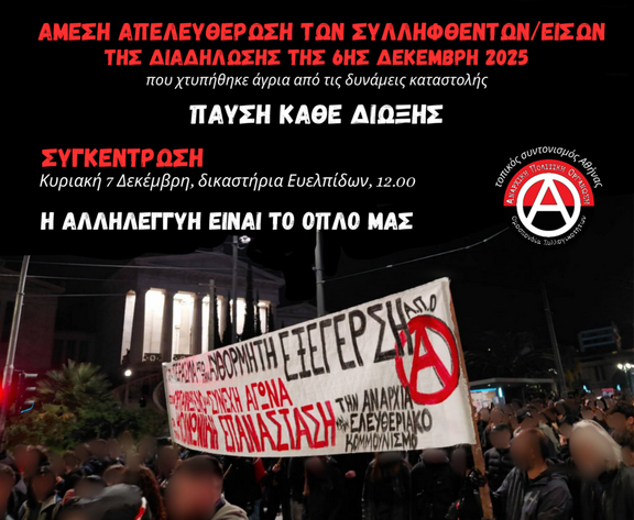 ΑΜΕΣΗ ΑΠΕΛΕΥΘΕΡΩΣΗ ΤΩΝ ΣΥΛΛΗΦΘΕΝΤΩΝ/ΕΙΣΩΝ ΤΗΣ ΔΙΑΔΗΛΩΣΗΣ ΤΗΣ 6ης ΔΕΚΕΜΒΡΗ 2025, που χτυπήθηκε άγρια από τις δυνάμεις καταστολής