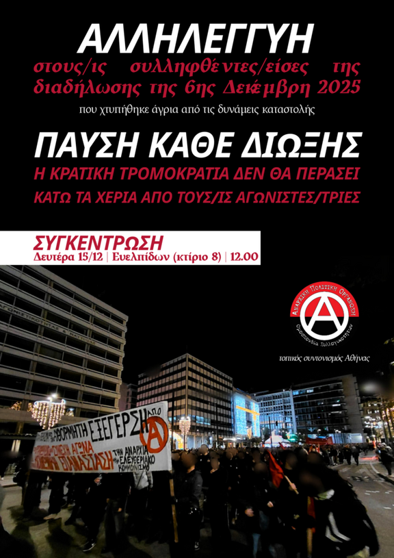Το Σάββατο 6 Δεκέμβρη 2025 η αστυνομία που είχε διαταχθεί περιμετρικά των αναρχικών μπλοκ της πορείας, στα οποία συμμετείχαν 6 - 7 χιλιάδες συντρόφισσες και σύντροφοι με κατάληξη το μνημείο του δολοφονημένου συντρόφου Αλέξανδρου Γρηγορόπουλου στα Εξάρχεια, επιτέθηκε σε όλο το μήκος τους και από όλες τις πλευρές στη συμβολή των οδών Πανεπιστημίου και Μπενάκη. Πρόκειται για μια πρωτοφανή την τελευταία περίοδο επίθεση, όσον αφορά την περικύκλωση και το χτύπημα χωρίς δυνατότητα διαφυγής τόσο μεγάλου πλήθους διαδηλωτών και τα δολοφονικά αποτελέσματα που αυτή θα μπορούσε να επιφέρει. Πρόκειται για μια υψηλού ρίσκου κατασταλτική επιχείρηση ώστε να καμφθεί η ακατάβλητη αγωνιστική διάθεση ενός σημαντικού μέρους της κοινωνίας που εκδηλώνεται σταθερά απέναντι σε κάθε συνθήκη και ανεξάρτητα από κάθε συσχετισμό ισχύς με την κρατική επιβολή.