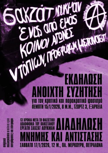Έχουν περάσει 13χρόνια από τη δολοφονία του Σαχτζάτ Λουκμάν από τα φασιστικά καθάρματα, μέλη της Χρυσής Αυγής, Χρήστο Στεργιόπουλο και Διονύση Λιακόπουλο. Οι δύο φασίστες έδρασαν εκείνη την μέρα στα Πετράλωνα στα πλαίσια της στρατηγικής της οργάνωσής τους. Τα φασιστικά μορφώματα αποτελούν οργανικό κομμάτι του καπιταλιστικού συστήματος. Χρησιμεύουν διαχρονικά ως δεκανίκι του κράτους και αποτελούν τον παρακρατικό μηχανισμό καταστολής και τρομοκρατίας ενάντια στους αγωνιστές, τις μετανάστριες. Πριμοδοτούνται από το σύστημα για να αποτελέσουν αντίβαρο στον κόσμο του αγώνα και να λειτουργήσουν ως κατασταλτικός μηχανισμός απέναντι στους κοινωνικούς και ταξικούς αγώνες.