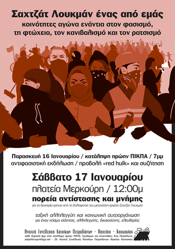 Στηρίζουμε τα καλέσματα το Σάββατο 17/01, στην Πλατεία Μερκούρη στις 12:00 στην αντιφασιστική πορεία για την δολοφονία του Σαχτζάτ Λουκμάν πριν απο 13 χρόνια στην περιοχή των Πετράλωνων.