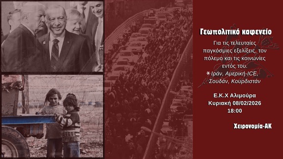 Την Κυριακή 8/2 σας προσκαλούμε σε πολιτικό καφενείο για τις τελευταίες γεωπολιτικές εξελίξεις. Ο καθένας και καθεμία μας που διαβάζει τις ειδήσεις, βομβαρδίζεται από νέα , αναλύσεις και δηλώσεις του κάθε μεγάλου και μικρομεσαίου άρχοντα λες και παρακολουθούμε επιτραπέζιο παιχνίδι με την τύχη του πλανήτη. Επειδή η ιστορία δεν γράφεται μόνο από τους μεγάλους και τα καπρίτσια τους αλλά με τις - από τα κάτω - κινήσεις των κοινωνιών και επειδή μόνοι μας με τον αλγόριθμο δεν θα βγάλουμε πραγματικά άκρη, μαζευόμαστε συλλογικά να τα βάλουμε κάτω. Ραντεβού στις 6 στον εκχ Αλιμουρα για ανοιχτή κουβέντα - καφενείο για Αμερική, Ιράν, Ροζαβα, Σουδάν.