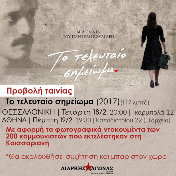 Με αφορμή την δημοσιοποίηση των φωτογραφικών ντοκουμέντων των 200 κομμουνιστών που εκτελέστηκαν στην Καισσαριανή, ο Διαρκής Αγώνας για την ταξική απελευθέρωση διοργανώνει την προβολή ταινίας σε Αθήνα και Θεσσαλονίκη.