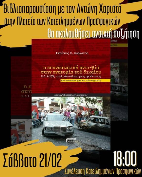 Το Σάββατο 21/2 στην Πλατεία των Κατειλημμένων Προσφυγικών θα φιλοξενήσουμε την παρουσίαση του Αντώνη Χαριστού της κοινωνικοοικονομικής και πολιτικής μελέτης του με τίτλο: "Η επαναστατική αντιβία στην ανατομία του δικαίου//Ε.Λ.Α - 17 Ν η ταξική ανάλυση μιας προέκτασης".