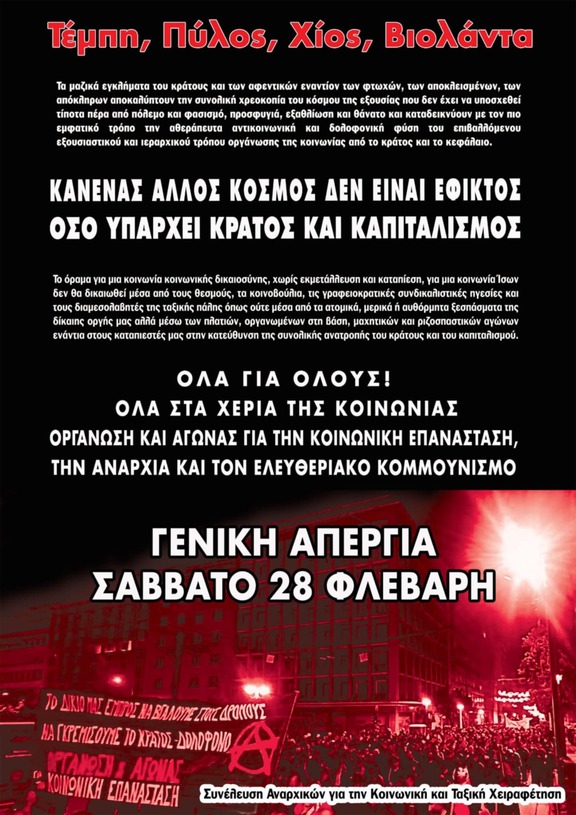 Τα μαζικά εγκλήματα του κράτους και των αφεντικών εναντίον των φτωχών, των αποκλεισμένων, των απόκληρων αποκαλύπτουν την συνολική χρεοκοπία του κόσμου της εξουσίας που δεν έχει να υποσχεθεί τίποτα πέρα από πόλεμο και φασισμό, προσφυγιά, εξαθλίωση και θάνατο και καταδεικνύουν με τον πιο εμφατικό τρόπο την αθεράπευτα αντικοινωνική και δολοφονική φύση του επιβαλλόμενου εξουσιαστικού και ιεραρχικού τρόπου οργάνωσης της κοινωνίας από το κράτος και το κεφάλαιο.