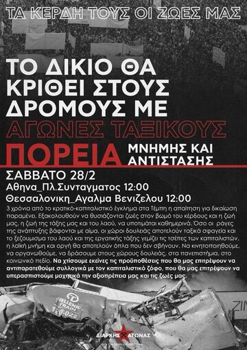 28 Φλεβάρη 2026: 3 χρόνια από την κρατική-καπιταλιστική δολοφονία 57 ανθρώπων στα Τέμπη. Μέρα που όλοι εμείς, η κοινωνική βάση, οι εργαζόμενοι και οι εργάτριες πρέπει να βρεθούμε στους δρόμους καταλαμβάνοντας λίγο από τον χαμένο χώρο και χρόνο που εδώ και χρόνια κράτος και κεφάλαιο μας κλέβουν. Μέρα που δεν πρέπει να μείνει ως μόνο μέρα θλίψης, αλλά να μετατραπεί σε σημείο οργής, οργάνωσης και αγώνα.