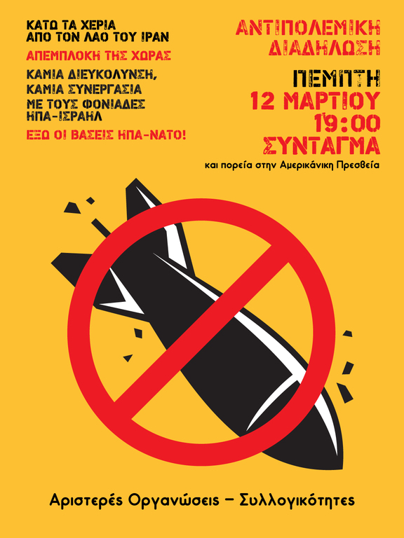 Πάρτε μέρος στην αντιπολεμική - αντιιμπεριαλιστική διαδήλωση Πέμπτη 12/3/2026, 7 μ.μ., Σύνταγμα, πορεία στην αμερικάνικη πρεσβεία.