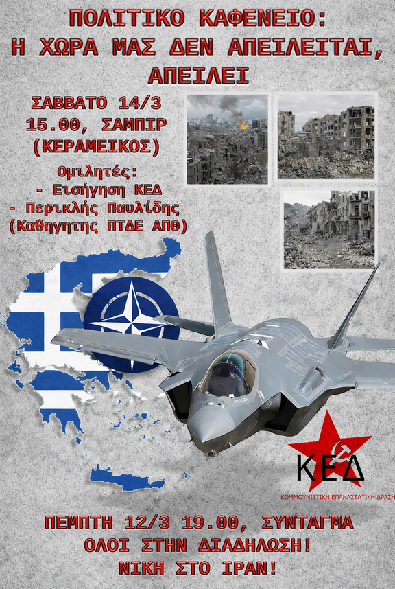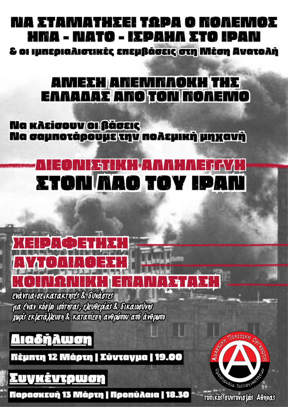 Ενάντια στις αποφάσεις αυτές που πάνε κόντρα στα συμφέροντα της κοινωνικής πλειοψηφίας, και την ίδια ώρα που όλα τα κοινωνικά αγαθά (υγεία, εκπαίδευση, μεταφορές, υποδομές) υποτιμώνται, ιδιωτικοποιούνται και ξεπουλιούνται, συμμετέχουμε στην αντιπολεμική διαδήλωση στο Σύνταγμα την Πέμπτη 12/3 και ώρα 19:00, με στόχο να καταδείξουμε την εναντίωση μας στην εμπλοκή της Ελλάδας στον πόλεμο στη Μέση Ανατολή. Επιπλέον, καλούμε όλες κι όλους σε ανοιχτή αντιπολεμική-αντιμπεριαλιστική συνέλευση τη Δευτέρα 16/3 στις 18:30 στην ΑΣΟΕΕ.