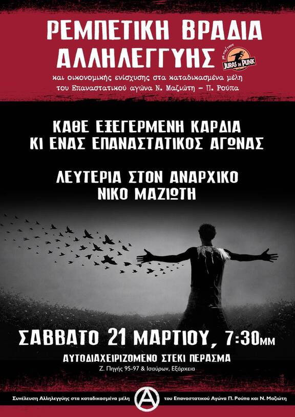 *Για την οικονομική ενίσχυση του αναρχικού συντρόφου Νίκου Μαζιώτη που παραμένει αιχμάλωτος στις φυλακές της δημοκρατίας. Επίσης για τη στήριξη της αναρχικής συντρόφισσας Πόλας, η οποία αν και είναι εκτός φυλακής βρίσκεται σε καθεστώς περιοριστικών όρων μέχρι το 2030 και διαβιεί σε συνθήκη οικονομικής ομηρίας κι εξόντωσης. Πόλα Ρούπα: Η ΟΜΗΡΙΑ ΔΕΝ ΤΕΛΕΙΩΝΕΙ ΑΠΛΩΣ ΑΛΛΑΖΕΙ ΠΡΟΣΩΠΟ https://www.athens.indymedia.org/post/1637572…