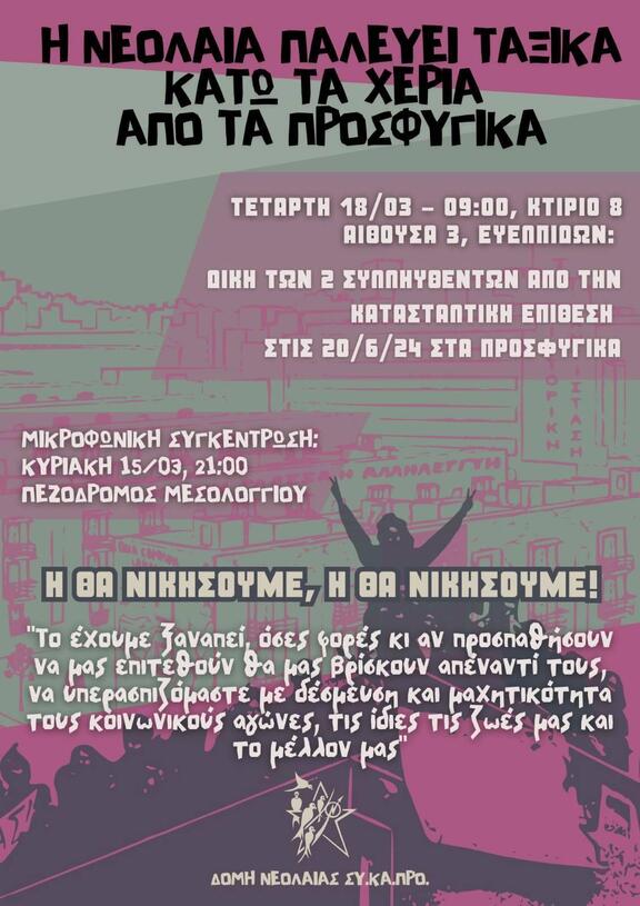 Στις 18/3/26 εκδικάζεται η υπόθεση των δύο συντρόφων και μελών της Κοινότητας Κατειλημμένων Προσφυγικών, οι οποίοι απήχθησαν από ομάδα ΟΠΚΕ στις 20/6/2024 από δρόμο των Προσφυγικών. Η κατασταλτική επιχείρηση εκείνης της μέρας είναι συνδεδεμένη με τη δυναμική απάντηση της κοινότητας στις 18/6/2024 όταν άντρες της ομάδας ΔΡΑΣΗ πραγματοποίησαν προληπτικές προσαγωγές σε 4 νεαρά μέλη της κοινότητας, εντός κι εκτός γειτονιάς. Ο κόσμος της γειτονιάς αντέδρασε κι έκανε εμφανή την παρουσία του στον δρόμο μπροστά στη ΓΑΔΑ σε ώρες αιχμής, γεγονός που έδωσε ορατότητα και εξέθεσε την αστυνομική βία και αυθαιρεσία και τις παράνομες και παράτυπες κατασταλτικές μεθόδους του κράτους.