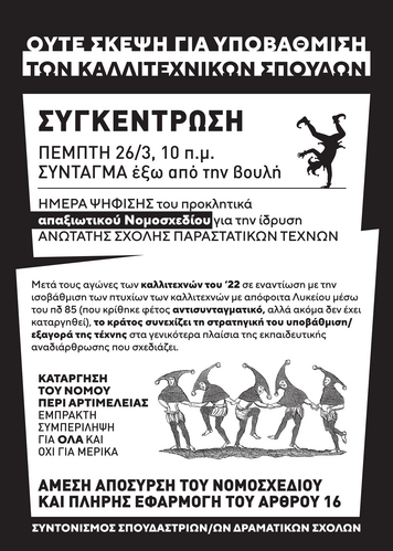 Μετά τους αγώνες των καλλιτεχνών του '22 σε εναντίωση με την ισοβάθμιση των πτυχίων των καλλιτεχνών με απόφοιτα Λυκείου μέσω του πδ 85 (που κρίθηκε φέτος αντισυνταγματικό, αλλά ακόμα δεν έχει καταργηθεί), το κράτος συνεχίζει τη στρατηγική του υποβάθμιση/εξαγορά της τέχνης στα γενικότερα πλαίσια της