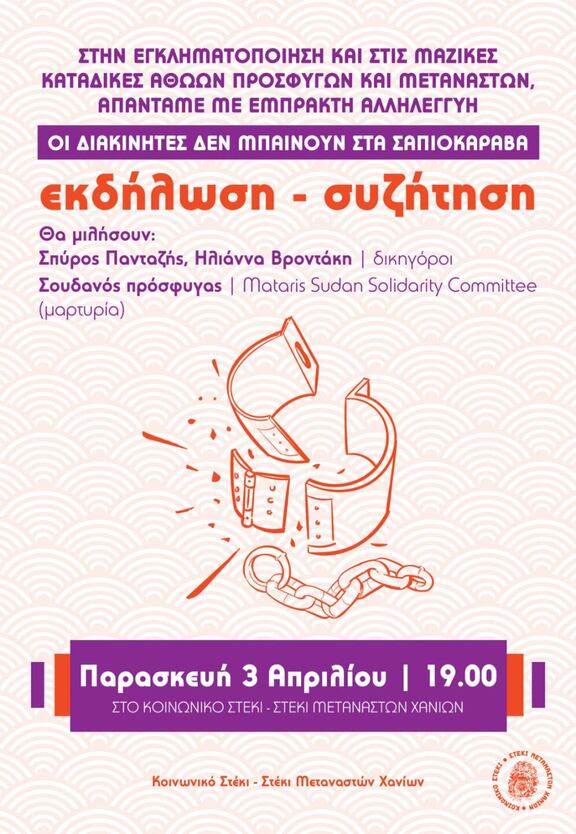 Ομιλητές θα είναι: οι δικηγόροι Σπύρος Πανταζής και Ηλιάννα Βροντακη, και θα υπάρχει μαρτυρία ενός Σουδανού πρόσφυγα από το Mataris Sudan Solidarity Committee.
