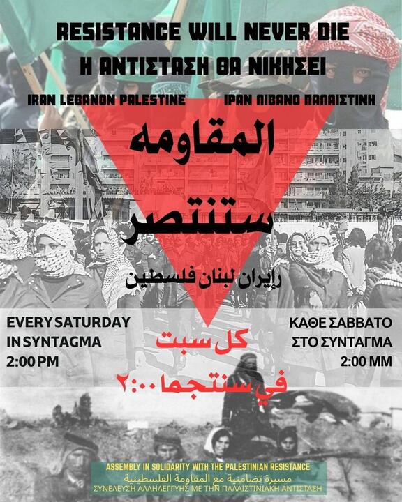 It is more crucial than ever to show solidarity with the Palestinian people, stand and struggle by their side, as well as those in the Global South whose homes, communities, and lives have been looted by colonial and capitalist wars. We are called on to build a robust anti-war and anti-imperialist movement, one that is commited to holding those responsible for these crimes accountable, all while confronting and fighting those here, in the belly if the beast, who protect the interest of the imperialist agenda. In the streets, outside the bases, at sea. We must be everywhere. We call on all to join us for our gathering this Saturday and every Saturday after it at Syntagma, 2 PM.