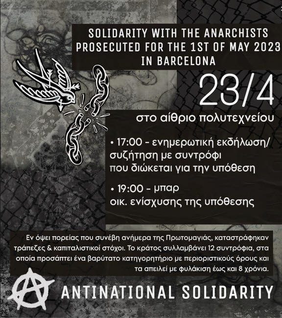 Εν όψει πορείας Πρωτομαγιάς, που έγινε στην Βαρκελώνη το 2023, καταστράφηκαν τράπεζες και άλλοι καπιταλιστικοί στόχοι. Το κράτος συλλαμβάνει 12 άτομα στα οποία προσάπτει ένα βαρύτατο κατηγορητήριο, θέτει περιοριστικούς όρους ενώ απειλεί με φυλάκιση μέχρι και 8 χρόνια.