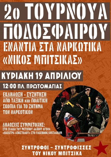 Φέτος, συνεχίζοντας αυτή τη προσπάθεια τιμής και μνήμης για τον σύντροφό μας και ανάδειξης του αγώνα ενάντια στα ναρκωτικά ως τμήμα της συνολικής λαϊκής πάλης, σας προσκαλούμε στο 2ο τουρνουά ποδοσφαίρου ενάντια στα ναρκωτικά «Νίκος Μπίτσικας».
