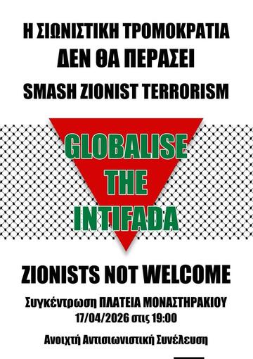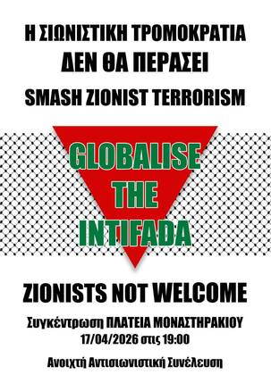 Κάλεσμα σε μαζική συγκέντρωση ενάντια στη σιωνιστική τρομοκρατία στις γειτονιές και τις ζωές μας - Παρασκευή 17/4 στις 19:00, Πλατεία Μοναστηράκι.