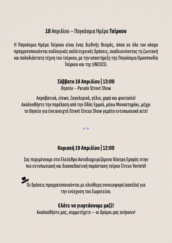 Στο πλαίσιο αυτού του σημαντικού εορτασμού, ανεξάρτητοι καλλιτέχνες του τσίρκου, ζογκλέρ, ξυλοπόδαροι, ακροβάτες, κλόουν και πάσης φύσης τσιρκολάνοι ενώνουμε τις δυνάμεις μας και ξεχυνόμαστε στους δρόμους της Αθήνας, (και όχι μόνο) προσφέροντας αστέρευτο κέφι και χαρά συμμετέχοντας ενεργά σε συλλογικές, εθελοντικές δράσεις και παραστάσεις που θα πραγματοποιηθούν Σάββατο 18 και Κυριακή 19 Απριλίου.