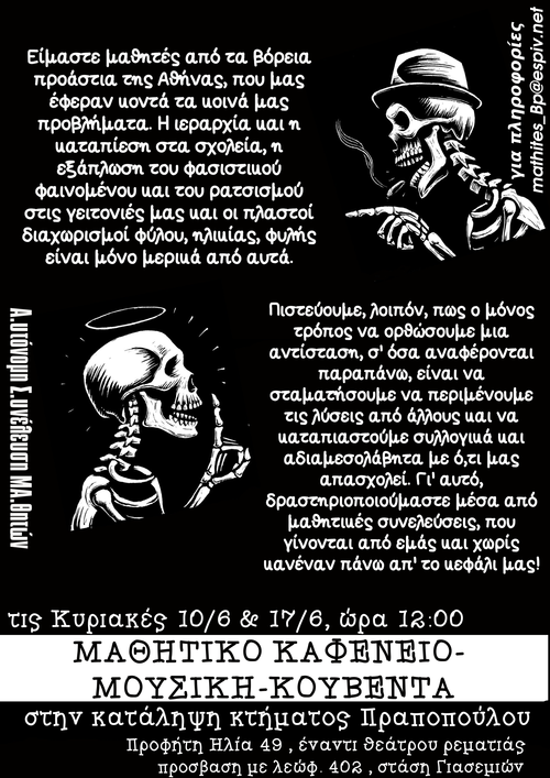 Πιστεύουμε λοιπόν, πως ο μόνος τρόπος να ορώσουμε μια αντίσταση, σ`όσα αναφέρονται παραπάνω, είναι να σταματήσουμε να περιμένουμε τις λύσεις από άλλους και να καταπιαστούμε συλλογικά και αδιαμεσολάβητα με ό,τι μας απασχολεί. Γι`αυτό δραστηριοποιούμαστε μέσα από μαθητικές συνελεύσεις και άλλου είδους δραστηριότητες, που γίνοται από εμάς και χωρίς κανέναν πάνω απ'το κεφάλι μας!