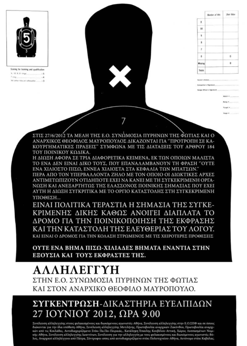 Στις 27/6 τα μέλη της Ε.Ο Συνωμοσία Πυρήνων της Φωτιάς και ο αναρχικός Θεόφιλος Μαυρόπουλος δικάζονται συμφώνα με τις διατάξεις του άρθρου 184 του Ποινικού Κώδικα που αναφέρει «Όποιος δημόσια με οποιονδήποτε τρόπο προκαλεί ή διεγείρει σε διάπραξη κακουργήματος ή πλημμελήματος τιμωρείται με φυλάκιση μέχρι τριών ετών». Η δίωξη αφόρα σε τρία διαφορετικά κείμενα, εκ των οποίων μάλιστα το ένα δεν είναι δικό τους, στα οποία επαναλαμβάνεται η φράση ''ούτε ένα χιλιοστό πίσω, εννέα χιλιοστά στα κεφάλια των μπάτσων.'' Πιο συγκεκριμένα:Η πρώτη δίωξη ήταν για το κείμενο των μελών της Συνωμοσίας Πυρήνων της Φωτιάς και του αναρχικού Θεόφιλου Μαυρόπουλου με τίτλο «Αλληλεγγύη από τη ΣΠΦ και το Θ. Μαυρόπουλο προς το αναρχικό στέκι ΝΑΔΙΡ» Το κείμενο αλληλεγγύης αφορούσε την εισβολή που έγινε στις 4/10/11 στο αναρχικό στέκι Ναδίρ από μπάτσους διαφόρων υπηρεσιών (ασφαλίτες, ΟΠΚΕ και άλλων), ενώ πριν είχε περικυκλωθεί το γύρο τετράγωνο με διμοιρίες ΜΑΤ, ομάδες ΔΙΑΣ και ΖΗΤΑ.