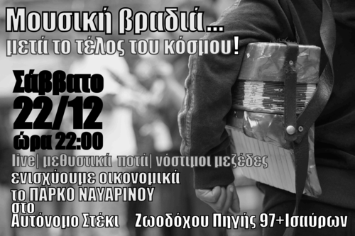 ΣΑΒΒΑΤΟ 22 ΔΕΚΕΜΒΡΙΟΥ, ΣΤΙΣ 22.00, ΣΤΟ ΑΥΤΟΝΟΜΟ ΣΤΕΚΙ,ΖΩΟΔΟΧΟΥ ΠΗΓΗΣ 97 & ΙΣΑΥΡΩΝ