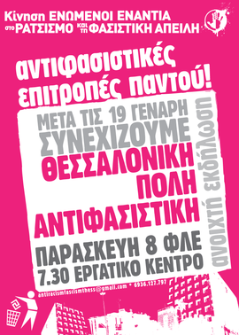 Στις 8 Φλεβαρη στο Εργατικό Κέντρο η ΚΕΡΦΑ Θεσσαλονίκης καλεί όλους τους αντιφασίστες και αντιφασίστριες της πόλης να συζητήσουμε και να οργανώσουμε τα επόμενα βήματα μετά τις 19 Γενάρη! Να χτίσουμε αντιφασιστικές επιτροπές παντού! Σε κάθε γειτονιά, εργατικό χώρο, σχολείο και σχολή. Πριν την εκδήλωση θα προβληθεί βίντεο από τη διαδήλωση και συναυλία της 19 Γενάρη, ενώ στη συζήτηση το λόγο θα έχουν αγωνιστές από γειτονιές, εργατικούς χώρους, σχολές και σχολεία.
