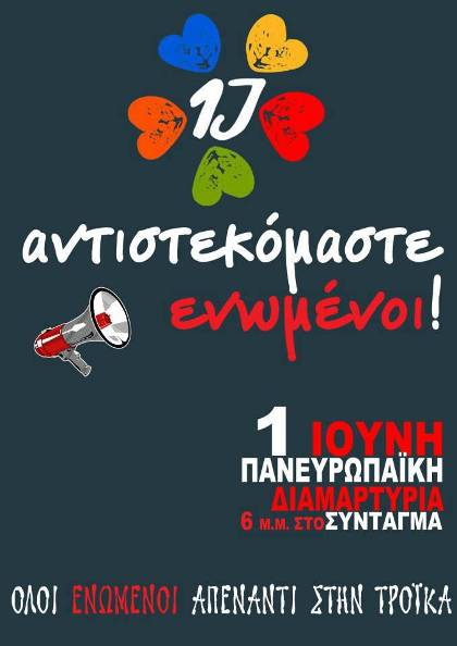 Ημέρα διαμαρτυρίας ενάντια στην τρόικα και τις πολιτικές λιτότητας κήρυξαν την 1η Ιουνίου κινήματα πολιτών που συναντήθηκαν στη Λισαβόνα και ανέλαβαν την πρωτοβουλία για τη δράση «Λαοί ενωμένοι ενάντια στην τρόικα», σε όλες τις ευρωπαϊκές πρωτεύουσες. Στην Αθήνα, το ραντεβού είναι για τις 18.00 το απόγευμα του Σαββάτου, στην πλατεία Συντάγματος. Οι διοργανωτές διευκρινίζουν ότι "η οργάνωση στηρίζεται από τα κάτω και στην αυθόρμητη πρωτοβουλία όλων μας", και καλούν "όλους τους πολίτες, με ή χωρίς κόμμα, με ή χωρίς δουλειά, με ή χωρίς ελπίδα, όλες τις συλλογικότητες, τις πολιτικές οργανώσεις, τα κοινωνικά κινήματα, συνδικάτα, κόμματα, συλλογικότητες, άτυπες ομάδες να ενωθούν μαζί μας., όλους τους καλλιτέχνες να μας στηρίξουν με την παρουσία τους στην πλατεία".