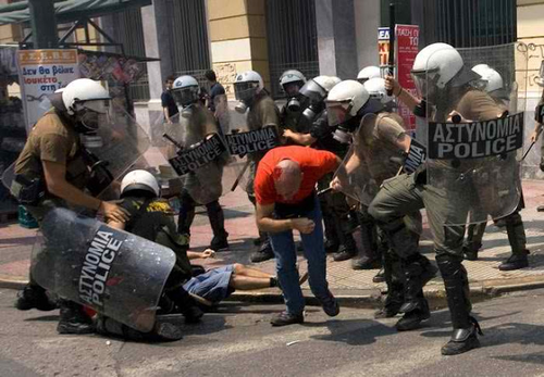 Ο Δημήτρης έχει ριχτεί κάτω και ξυλοκοπείται ενώ σε έναν ηλικιωμένο περαστικό τα ΜΑΤ του έχουν ανοίξει το κεφάλι