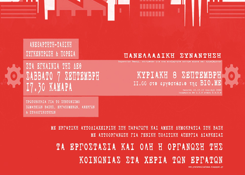 Στις σημερινές συνθήκες της καπιταλιστικής χρεοκοπίας χρειαζόμαστε περισσότερο παρά ποτέ ένα εργατικό κίνημα με νέες δομές, απαλλαγμένο από τις πρακτικές και τις παθογένειες του παρελθόντος. Ένα εργατικό κίνημα από την βάση, χωρίς καρεκλοκένταυρους γραφειοκράτες, σωματεία σφραγίδες και αποφάσεις πίσω από κλειστές πόρτες. Ένα κίνημα που θα συνενώνει τους εργάτες με όλους αυτούς που παρέμεναν όλα αυτά τα χρόνια αποκλεισμένοι από την συνδικαλιστική γραφειοκρατία, όπως οι άνεργοι και οι επισφαλώς εργαζόμενοι. και το οποίο θα αγωνίζεται για την ολοκληρωτική ανατροπή του καπιταλιστικού συστήματος εκμετάλλευσης και που θα οδηγήσει στην ανθρώπινη χειραφέτηση.