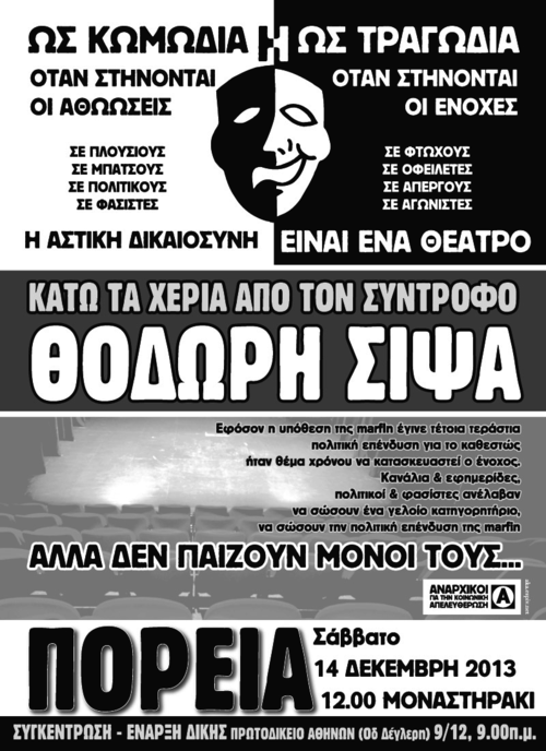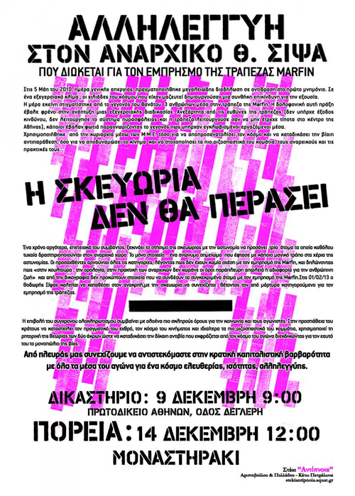 Τον Μάη του 2011, στοχοποιούνται τρεις αναρχικοί, οι οποίοι προσάγονται από τις αστυνομικές αρχές για την υπόθεση του εμπρησμού της Marfin, χωρίς κανένα απολύτως στοιχείο. Το Φλεβάρη του 2013 οι δύο απαλλάσσονται οριστικά, όμως η πολιτική σκευωρία προχωρά με τη δίωξη και τελικά την παραπομπή σε δίκη στις 9 Δεκέμβρη 2013 του αγωνιστή Θ. Σίψα, που αρνείται από την πρώτη στιγμή όλες τις κατηγορίες και παραπέμπεται με μοναδικά ''στοιχεία'' τη συμμετοχή του στην απεργιακή διαδήλωση της 5ης Μάη και την πολιτική του ταυτότητα. Η καφκικού χαρακτήρα πολιτική δίωξη στο πρόσωπό του στρέφεται εναντίον κάθε αγωνιστή και ευρύτερα των κοινωνικών αντιστάσεων, και έχει ως στόχο τόσο να ποινικοποιηθεί η συμμετοχή σε μια μαχητική διαδήλωση όσο και το να εγκληματοποιηθεί ο αναρχικός αγώνας.