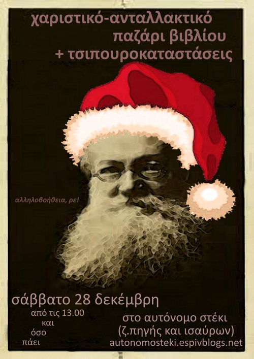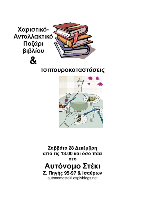 Σάββατο 28 Δεκέμβρη από τις 13:00 (και όσο πάει): Χαριστικό/Ανταλλακτικό Παζάρι Βιβλίου και Τσιπουροκαταστάσεις