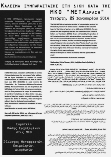 Την Τετάρτη 29/1/2014 εκδικάζεται η αγωγή κατά της ΜΚΟ ΜΕΤΑδραση για εκδικητική απόλυση μέλους του ΔΣ του Σωματείου Βάσης Εργαζομένων σε ΜΚΟ (ΣΒΕΜΚΟ).