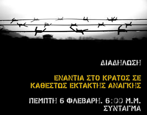 Κάθε μέρα κρατικής δράσης επιβεβαιώνει το καθεστώς εκτάκτου ανάγκης το οποίο οδηγεί και ενισχύει την κατάσταση εξαίρεσης προλειαίνοντας το έδαφος του ολοκληρωτισμού. Καμιά πλέον «νομική» προστασία δεν είναι ικανή να εμποδίσει την επιβολή της εξουσίας πάνω στην κοινωνία και ιδιαίτερα στον κόσμο της αντίστασης που συνεχώς διευρύνεται στο βαθμό που η καπιταλιστική κρίση έχει επιφέρει τελειωτικό χτύπημα στο κοινωνικό δεσμό που συγκροτούνταν στην ψευτοενότητα της «ευημερίας» και του καταναλωτισμού.