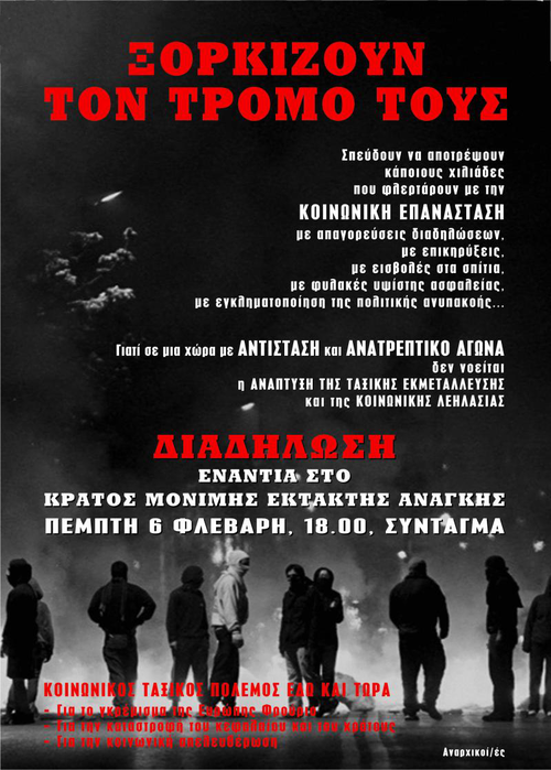 Σε μια εποχή που οι κυρίαρχοι το μόνο που έχουν να προσφέρουν είναι λεηλασία των από τα κάτω, φτώχεια, εξαθλίωση, μιζέρια και θάνατο' είναι λογικό το καθεστώς έκτακτης ανάγκης να μην αποτελεί εξαίρεση αλλά κανόνα. Οι πολιτικοί διαχειριστές προκειμένου να διαφυλάξουν τα συμφέροντα του κεφαλαίου εξαπολύουν όλο το κατασταλτικό μηχανισμό τους για να καταστείλουν και να τρομοκρατήσουν όσους ορθώνουν το αναστημά τους ενάντια στη βαρβαρότητα που βιώνουμε καθημερινά στους δρόμους, στα εργασιακά κάτεργα, στα σχολεία και τις σχολές, στα "σωφρονιστικά" κολαστήρια, στα αιματοβαμμένα σύνορα της Ευρώπης φρούριο και σε κάθε χώρο όπου ζουν οι από τα κάτω.
