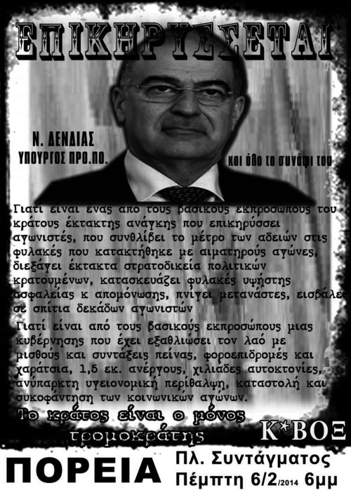 Δηλώνουμε στα πειθήνια όργανα της τρόικας που εξοντώνει τον λαό στη φυλακή των μνημονίων, πως οι ελευθερίες μας κερδήθηκαν με αίμα, ανατρέποντας την αστυνομικό-στρατιωτική χούντα και την δεξιά καραμανλική αυταρχία και δεν θα χαλαλιστούν στον κάθε Δένδια, τον υπουργό που στέκεται πάνω από τα νεκρά γυναικόπαιδα, τους δολοφονημένους μετανάστες στο Φαρμακονήσι, και κάνει στοχασμούς για την… «ποιότητά» τους.
