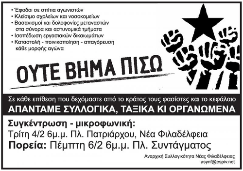 Σε αυτό το πλαίσιο, προγραμματίζουμε μια σειρά παρεμβάσεων στο επόμενο διάστημα, με πρώτες τη συμμετοχή στην αντικατασταλτική διαδήλωση την Πέμπτη 6 Φεβρουαρίου στις 6μ.μ. στο Σύνταγμα και την πραγματοποίηση πολιτικής εκδήλωσης, με θέμα «Όψεις της κρατικής τρομοκρατίας: Από τις διώξεις διαδηλωτών μέχρι την καταστολή των αναρχικών και από την εγκατάλειψη των φυλακισμένων ως την εξόντωση των πολιτικών κρατουμένων, το κράτος- τρομοκράτης είναι εδώ» την επόμενη Πέμπτη 13 Φεβρουαρίου στις 7μ.μ. στο Πολυτεχνείο.
