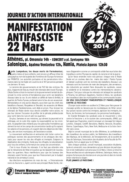 Στη παγκόσμια μέρα κατά του φασισμού και ρατσισμού στις 22 Μάρτη συντονιζόμαστε με διαδηλώσεις στο Λονδίνο, τη Γλασκώβη, το Κάρντιφ, το Παρίσι, την Βαρκελώνη, τη Ν. Υόρκη, τη Μελβούρνη, τη Κοπεγχάγη, τη Βαρσοβία, τη Βιέννη. Στέλνουμε το μήνυμα δεν θα περάσει ο φασισμός και ο ρατσισμός που επιχειρούν να αξιοποιήσουν τις πολιτικές των κυβερνήσεων της ΕΕ για να καρπωθούν την δυσαρέσκεια στις ευρωεκλογές του Μάη. Σε όλη την Ευρώπη, η αριστερά βρίσκεται μπροστά για την επιτυχία της διεθνούς κινητοποίησης στις 22 Μάρτη