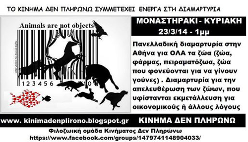 Το Kίνημα Δεν Πληρωνω θα συμμετάσχει στην Πανελλήνια Διαμαρτυρία που διοργανώνεται στο Μοναστηράκι, σχετικά με την βάναυση, άδικη και βάρβαρη μεταχείριση ΟΛΩΝ των ζώων για διατροφή, ένδυση, πειραματισμό και διασκέδαση προς όφελος του καπιταλιστικού συστήματος.