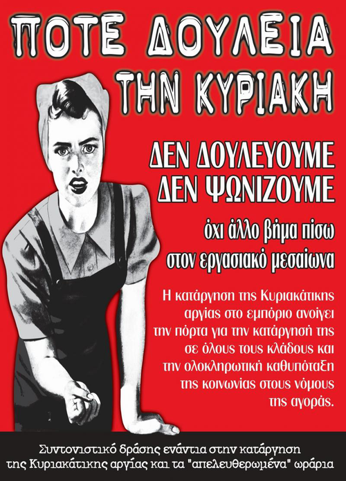 ΠΟΤΕ ΔΟΥΛΕΙΑ ΤΗΝ ΚΥΡΙΑΚΗ! ΟΛΟΙ ΤΗΝ ΚΥΡΙΑΚΗ 13/4 στις 11:00 ΣΤΟ ΣΥΝΤΑΓΜΑ