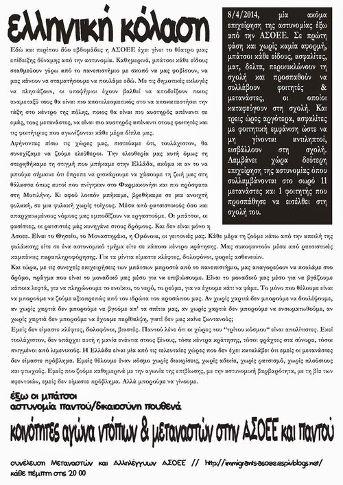 Πέμπτη 10 Απριλίου περνάνε οι 13 συλληφθέντες της επίθεσης των μπάτσων στην ασοεε, από τους οποίους οι 12 είναι μετανάστες και ο ένας φοιτητής.