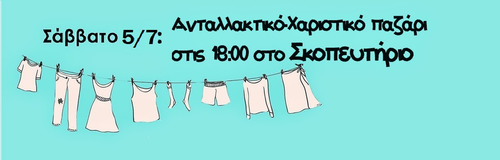 Όπως κάθε πρώτο Σάββατο του μήνα έτσι και το Σάββατο στις 5/7 θα γίνει το Χαριστικό-Ανταλλακτικό Παζάρι. Αυτή τη φορά στο Σκοπευτήριο συντροφεύοντας τις δραστηριότητες της ολοήμερης εκδήλωσης από τη villa amalias που θα γίνουν στη γειτονιά μας, στο χώρο του Σκοπευτηρίου.