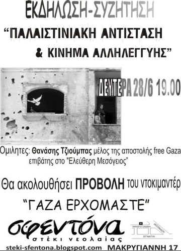 Να αναζητήσει τρόπους, τα μέσα, την προοπτική της διεθνούς αλληλεγγύης, μέσα από τον αντιπολεμικό-αντιιμπεριαλιστικό αγώνα ενάντια σε αυτούς μου ματοκυλάνε την Παλαιστίνη και γυρίζουν την Ελλάδα στον κοινωνικό μεσαίωνα.