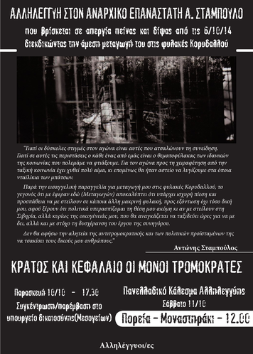 Aλληλεγγύη στον αναρχικό Α.Σταμπούλου, απεργό πείνας και δίψας από 6/10. Πορεία αλληλεγγύης Σάββατο 11/10 12:00 Μοναστηράκι.