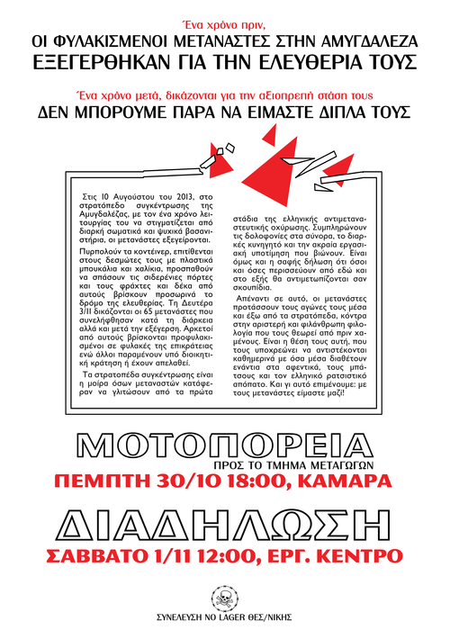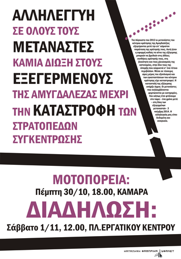 Η άδικη μεταχείριση, οι απαράδεκτες συνθήκες κράτησης και η ανάγκη για ελευθερία οδηγούν τους μετανάστες τον Αύγουστο του 2013 σε εξέγερση. Το αστικό κράτος απαντά με σκληρή καταστολή και η εκδικητική του μανία φαίνεται στις εξοντωτικές ποινές με τις οποίες απειλούνται οι συμμετέχοντες στην εξέγερση. Η φασιστική πορεία που επέλεξε το κράτος ως "αντίδοτο" στην κρίση θα μας βρει απέναντι ενάντιους και αλληλέγγυους στους εξεγερμένους μετανάστες. Η πάλη για ελευθερία, ανθρώπινες συνθήκες διαβίωσης και το αυτονόητο δικαίωμα στην αντίσταση ενάντια στον εξευτελισμό της ανθρώπινης υπόστασης δεν μπορεί να ποινικοποιηθεί.